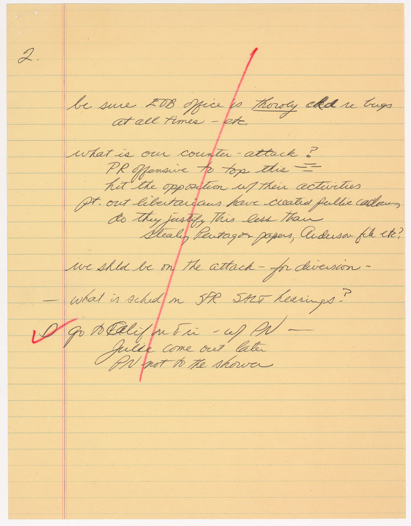 In addition to the two pages of handwritten notes, the team evaluated seven pages of handwritten notes from June 19, 1972; five pages of handwritten notes from June 21, 1972; and ten pages of handwritten notes from June 22, 1972; all from the Personal Files (1969-1973) of H. R. Haldeman now among the White House Staff Member and Office Files held by the Richard M. Nixon Presidential Library of the National Archives.